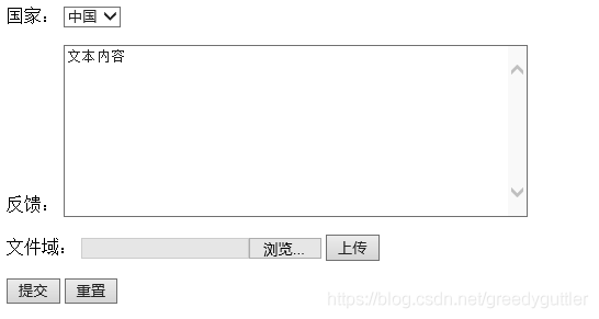 <form method="get" action="result.html"> <!--input:輸入框標簽,默認為text,文本框 name:為該輸入框起一個名字,用來提交數據 maxlength="8":文本框最多可以輸入8個字符 size="30":文本框的長度時30px --> <p>用戶名:<input type="text" name="username" value="文本框初始值" maxlength="8" size="30"/></p> <!--密碼框input type="password",密碼框輸入字符會顯示為小圓點--> <p>密碼:<input type="password" name="pwd"/></p> <!--radio:單選框 value:初始值,單選框必須填 name:成組,否則單選會出現錯誤 input標簽需要閉合 --> <p>性別: <input type="radio" value="boy" name="sex"/>男 <input type="radio" value="girl" name="sex"/>女 </p> <!--checkbox:多選框 value:與選項對應的值 checked:默認選中,在input標簽中使用 --> <p>愛好: <input type="checkbox" value="sleep" name="hobby"/>睡覺 <input type="checkbox" value="code" name="hobby"/>敲代碼 <input type="checkbox" value="chat" name="hobby"/>聊天 <input type="checkbox" value="game" name="hobby" checked/>游戲 </p> <!--button:普通按鈕 type="image":圖片按鈕,用圖片替換了按鈕的樣式 submit:提交按鈕,將value的值提交給name對應的值 reset重置按鈕,重置所有輸入框 value:value的值即為按鈕的名稱 --> <p>按鈕: <input type="button" name="btn1" value="點擊變長"/> <input type="image" src="1.jpg"/> </p> <!--select:下拉框標簽 option:下拉選項標簽 selected:默認選中,在下拉框標簽中使用 --> <p>國家: <select name="country"> <option value="cn" selected>中國</option> <option value="usa">美國</option> <option value="uk">英國</option> <option value="jp">日本</option> </select> </p> <!--textarea:文本域 cols:文本域的列數 rows:文本域的行數 --> <p>反饋: <textarea name="textarea" cols="50" rows="10">文本內容</textarea> </p> <!--type="file":文件域 注意1:文件域用來選擇文件,還需要一個上傳按鈕 注意2:此處有兩個name,上傳文件是將文件提交給了文件域對應的files 并非按鈕所對應的upload。 也就是說選擇文件后value=所上傳的文件,上傳后files=所上傳的文件 --> <p>文件域: <input type="file" name="files"> <input type="button" value="上傳" name="upload"> </p> <p> <input type="submit" value="提交"/> <input type="reset" value="重置"/> </p> </form>